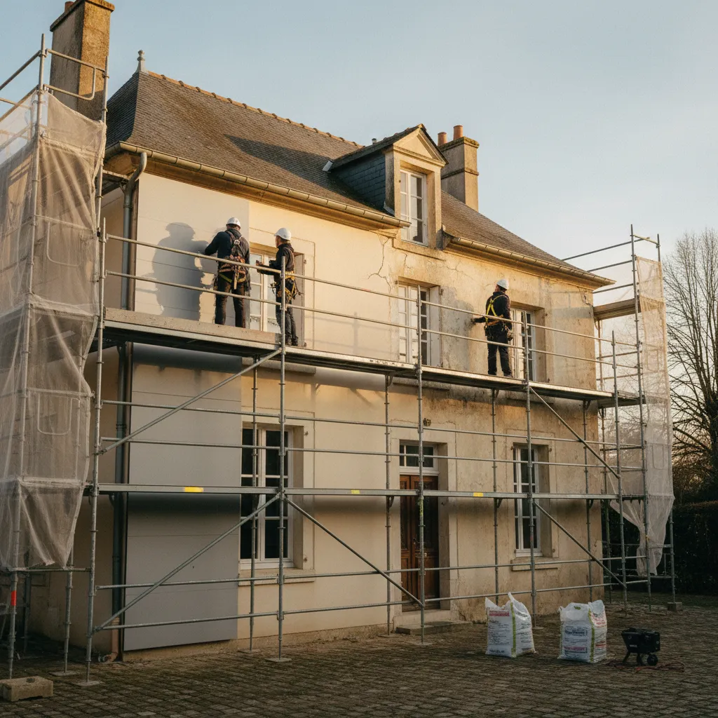 L’échafaudage représente un poste important. Pour une maison de plain-pied, comptez 15 à 20 €/m² de façade. Pour un R+2 ou plus, le coût monte à 25 à 35 €/m², car il faut des structures renforcées et parfois des autorisations d’occupation du domaine public. Pour les immeubles en copropriété, les règles spécifiques du ravalement en copropriété s’appliquent également.