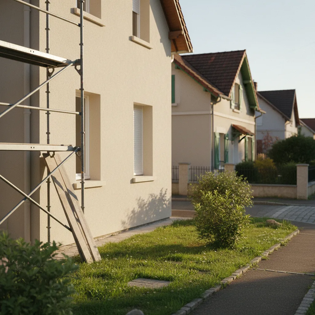 L’échafaudage est monté par une équipe spécialisée. Sur une maison à étage, cela représente 15 à 25 €/m² de façade. Si votre maison est en bordure de voie publique, une autorisation d’occupation du domaine public est nécessaire. Je prévois systématiquement des bâches de protection pour les menuiseries et les plantations.